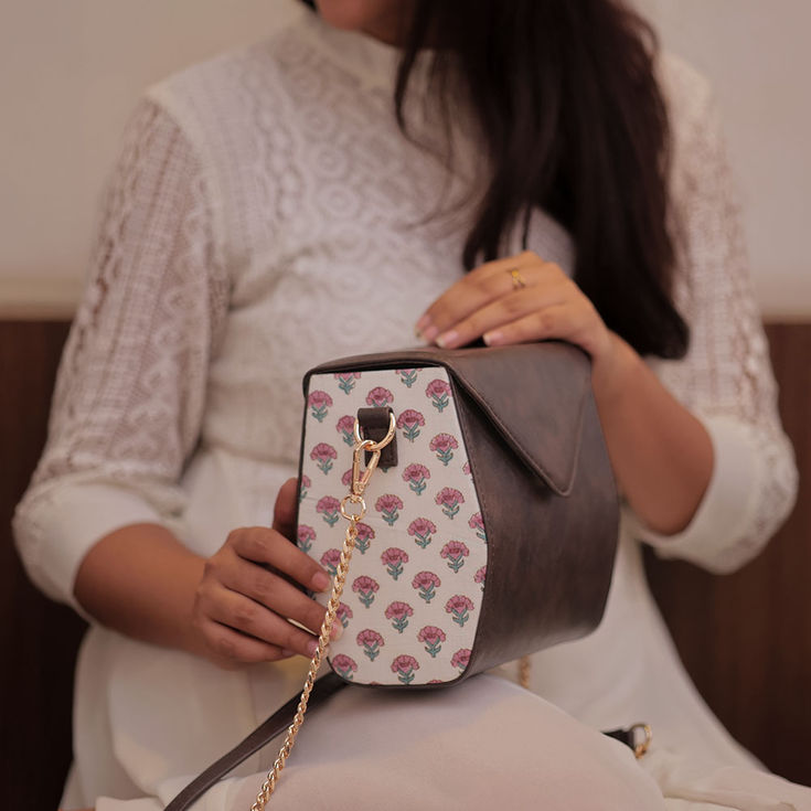 With its unique geometric silhouette, this statement sling bag blends modern design with Jaipuri booti detailing for a touch of elegance. Spacious, it’s perfect for carrying your essentials in style, making it a standout accessory for any occasion.