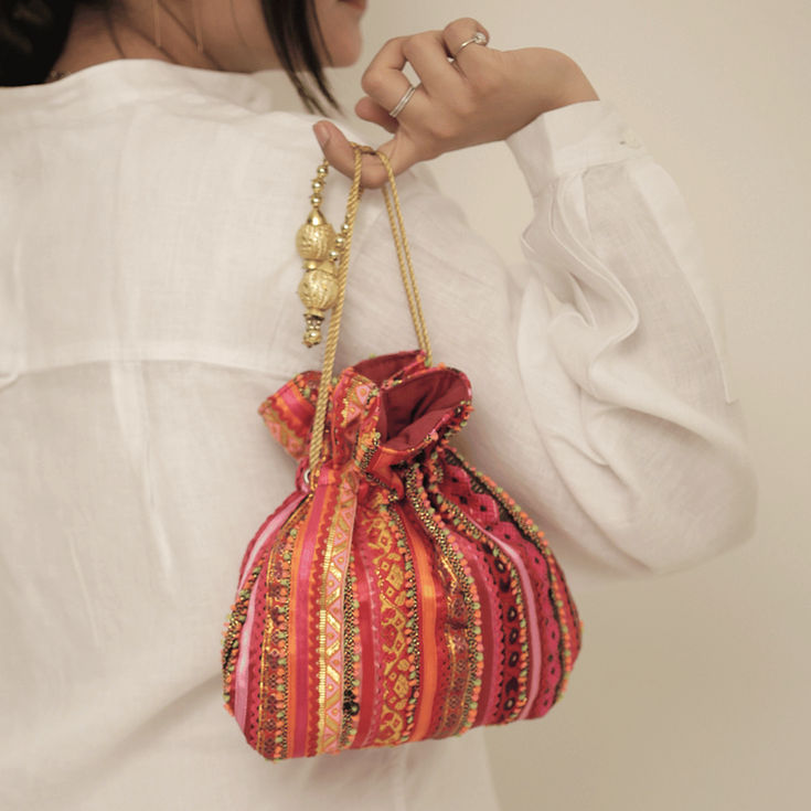 This handcrafted potli features exquisite multicolored lace embroidery, stitched in a refined linear pattern. A blend of tradition and timeless elegance.